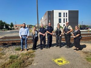 Rail Safety Week runs through Sunday, September 25, and Hastings Mayor Mary Fasbender, Deputy Chief of Police Bryan Schowalter, and Police Commander Kyle Linscheid gathered with officials from Canadian Pacific to place reminders at the Second Street rail crossing to remind pedestrians to look for trains. Detective Sergeant Micki Mair with the CP Rail System …